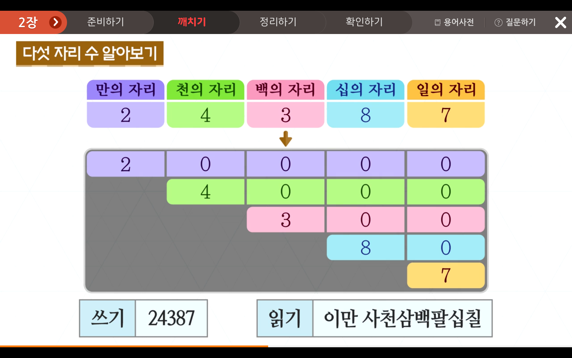 20000+ 4000+ 300+ 80+ 7 = 24387 이라 쓰고, 이만 사천삼백팔십칠 이라고 읽습니다.