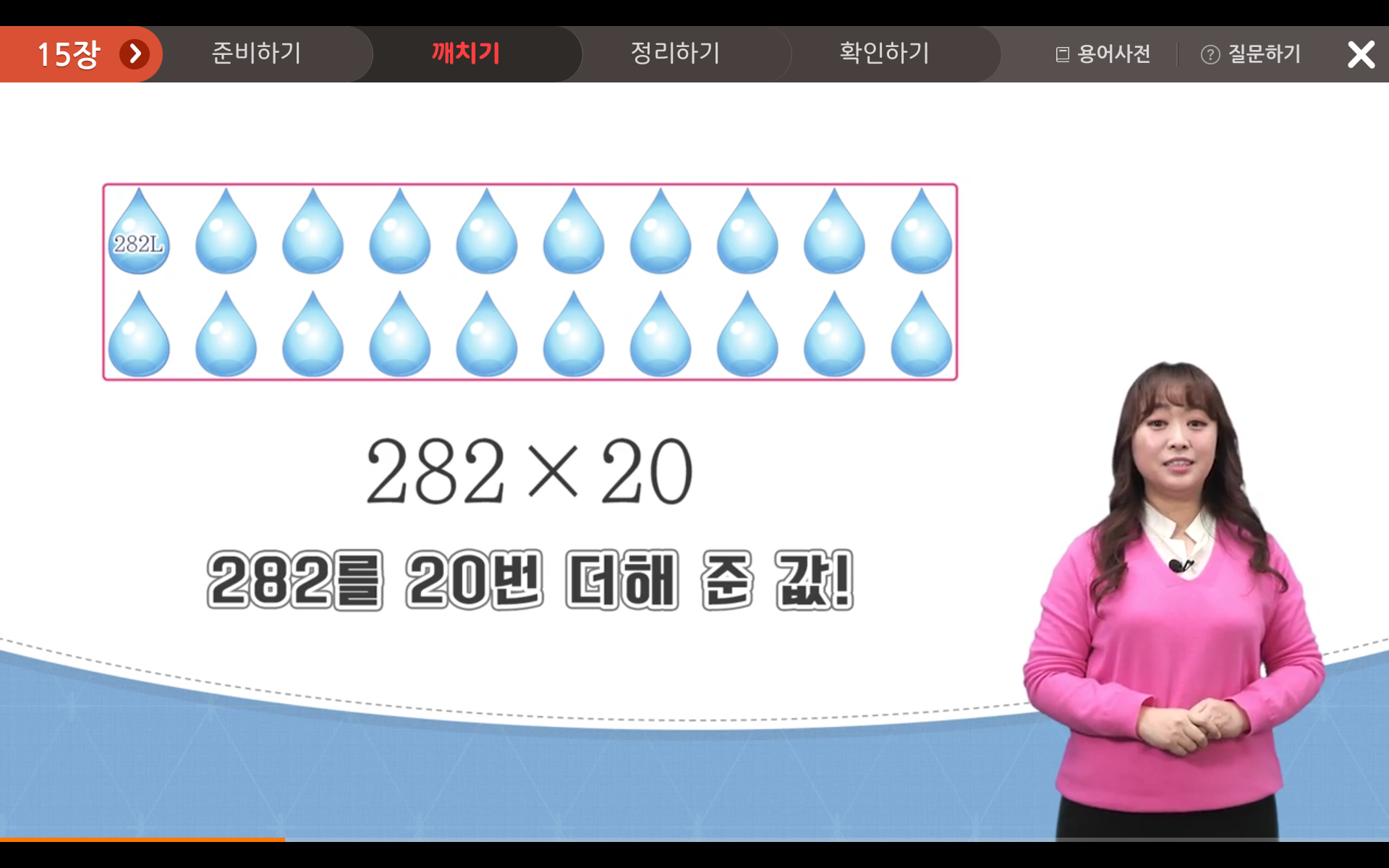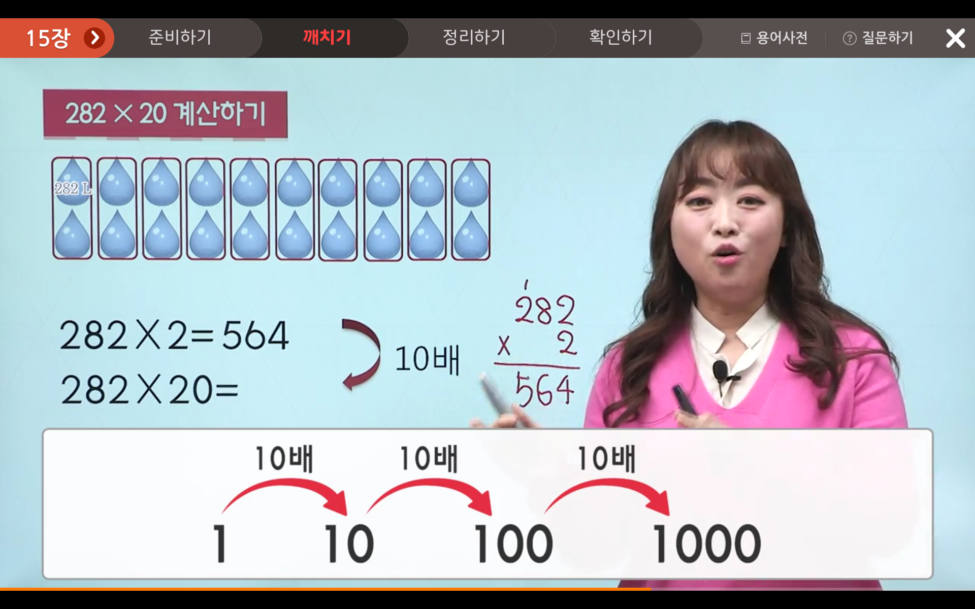 282 x 20은 282를 20번 더해 준 값이며, 282에 2배를 하고 그 값을 다시 10배 한 값과 같아요.