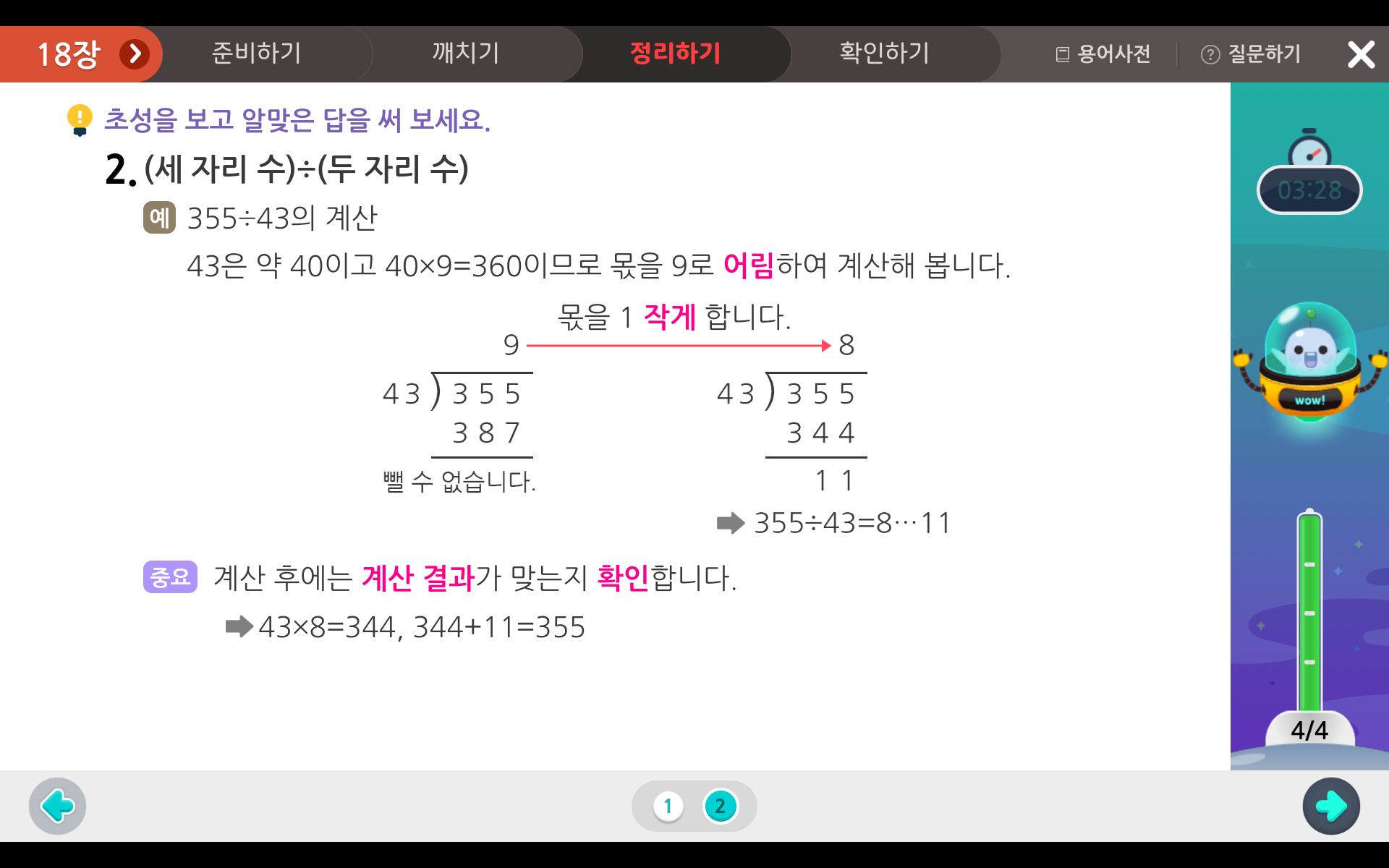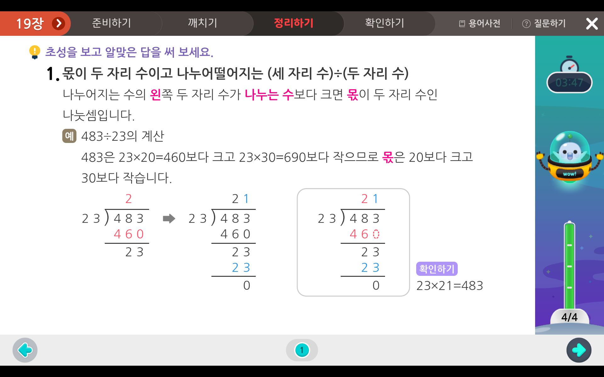 자리 수가 커져도 반복적으로 나눗셈 공부를 하다보면 어림 잡아 곱하기로 몫을 계산하지 않아도,