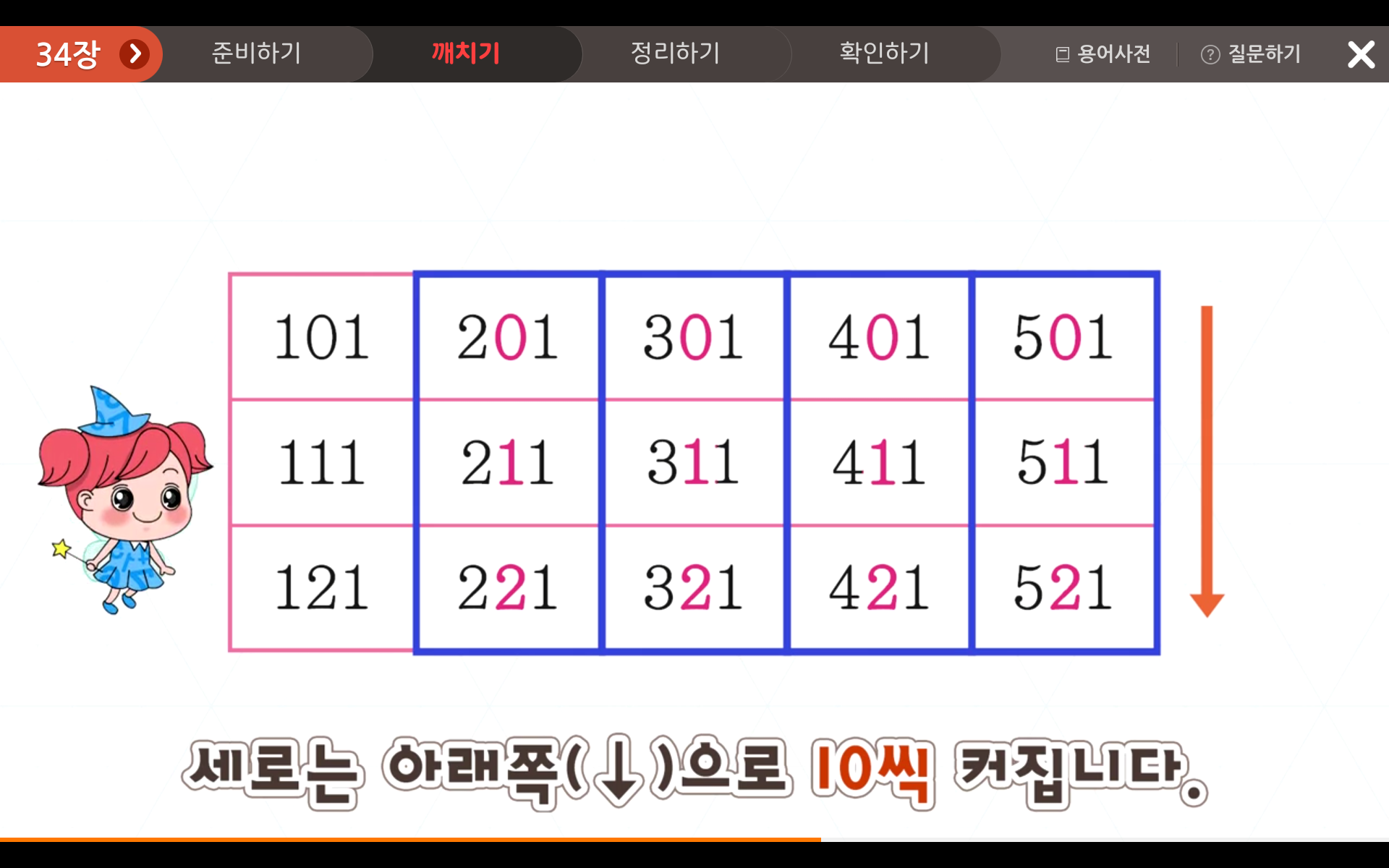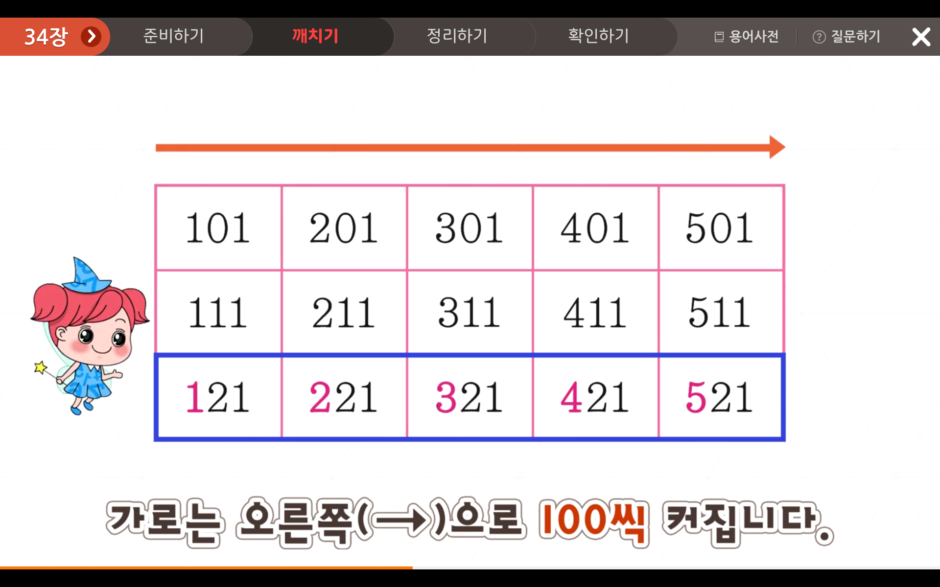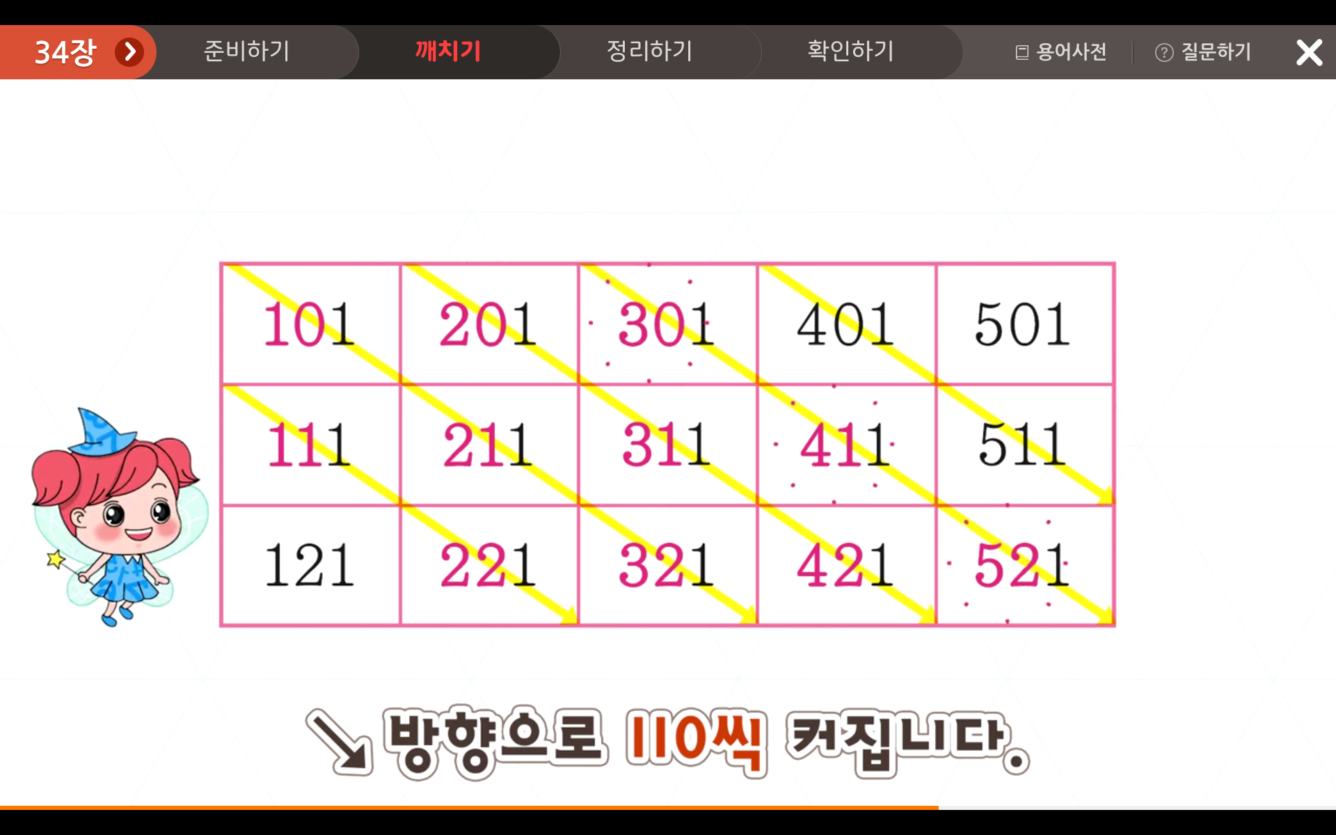 또한, 우방향 대각선으로는 110씩 커지는 규칙을 발견할 수 있습니다.