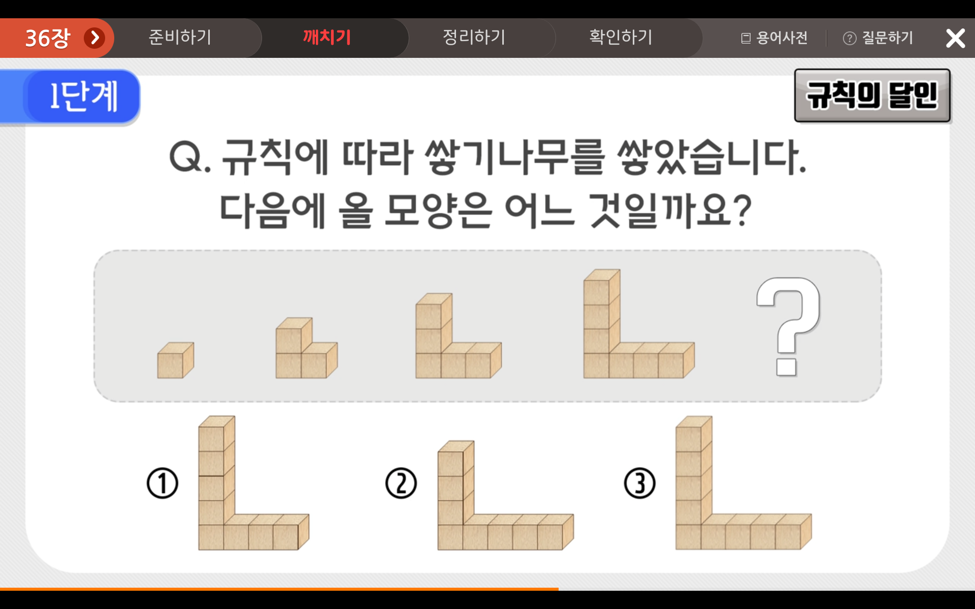나무쌓기의 규칙을 통해 마지막 ?에 들어갈 도형은 무엇일까요?
