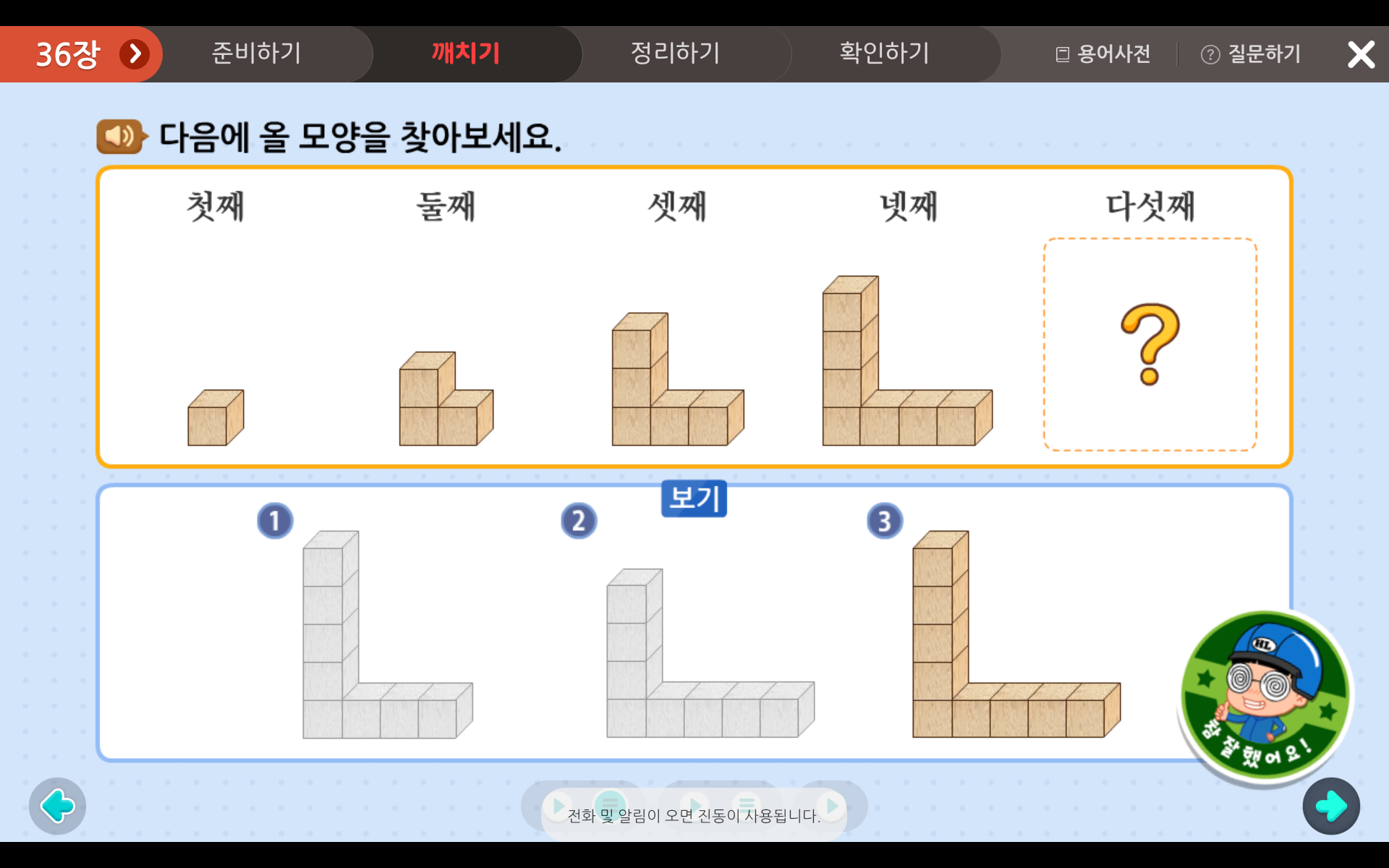 그럼, 다섯째 물음표에 들어갈 도형은 나무가 총 9개인 보기 3번임을 알 수 있습니다.