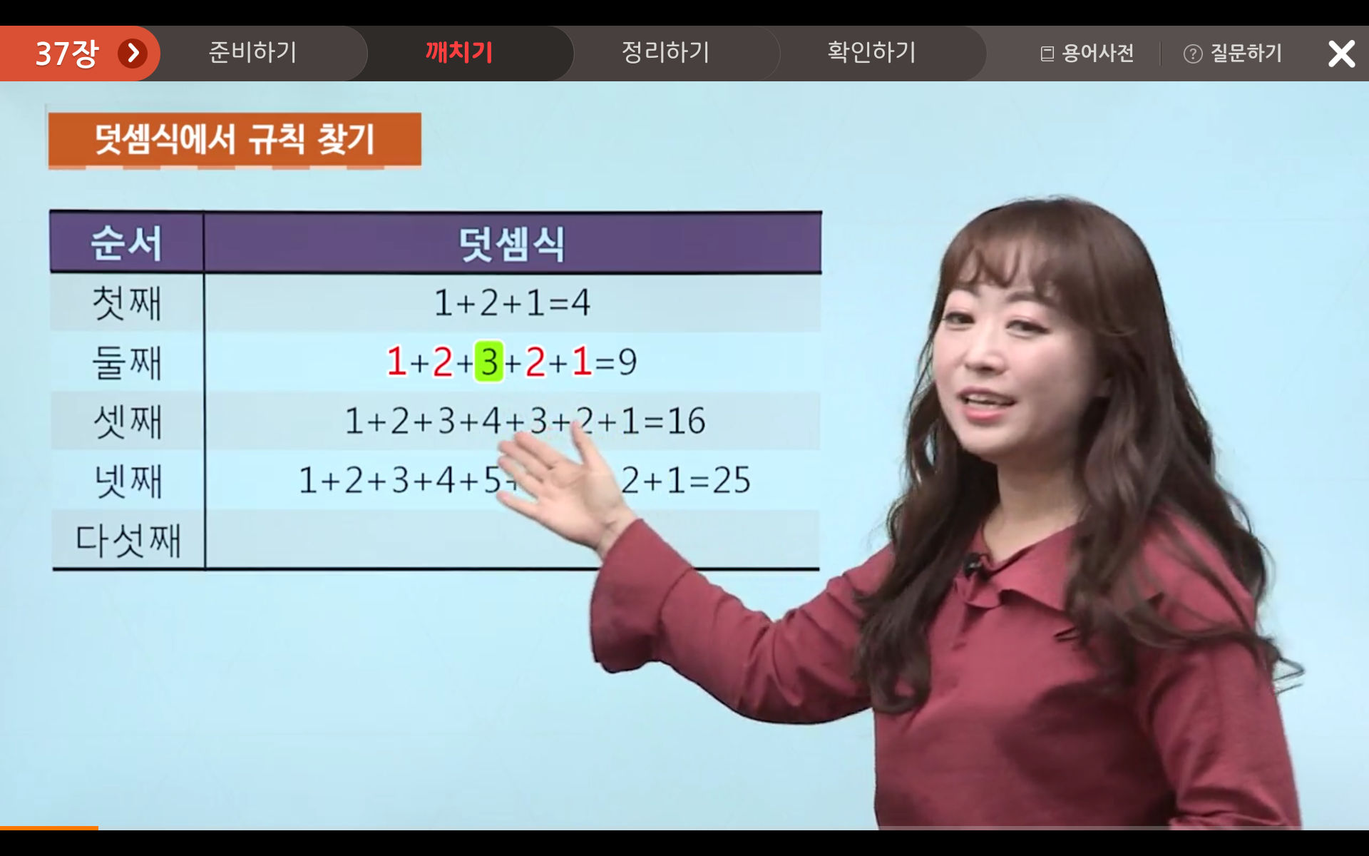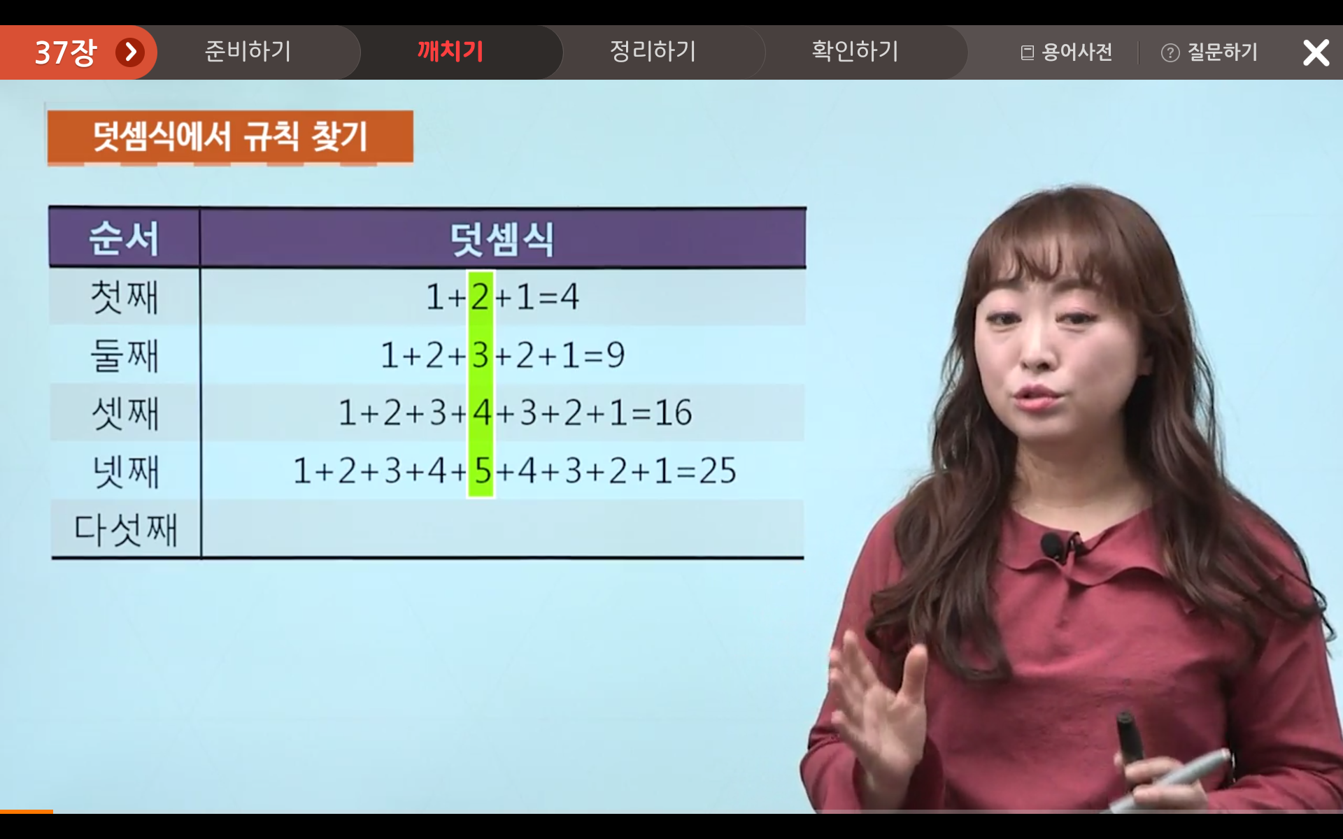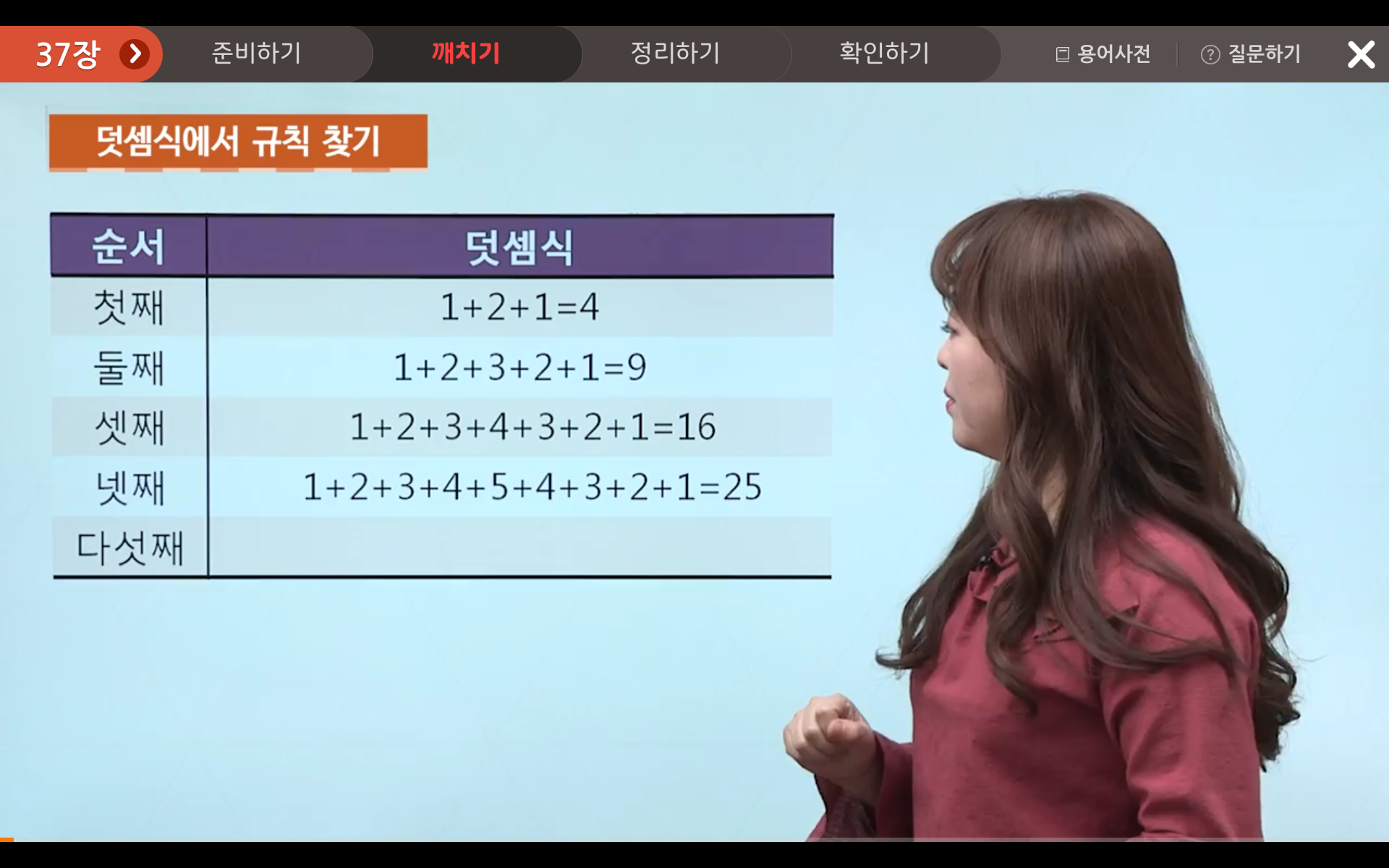 따라서, 다섯째는 1+2+3+4+5+6+5+4+3+2+1이고, 합은 36이 됩니다!