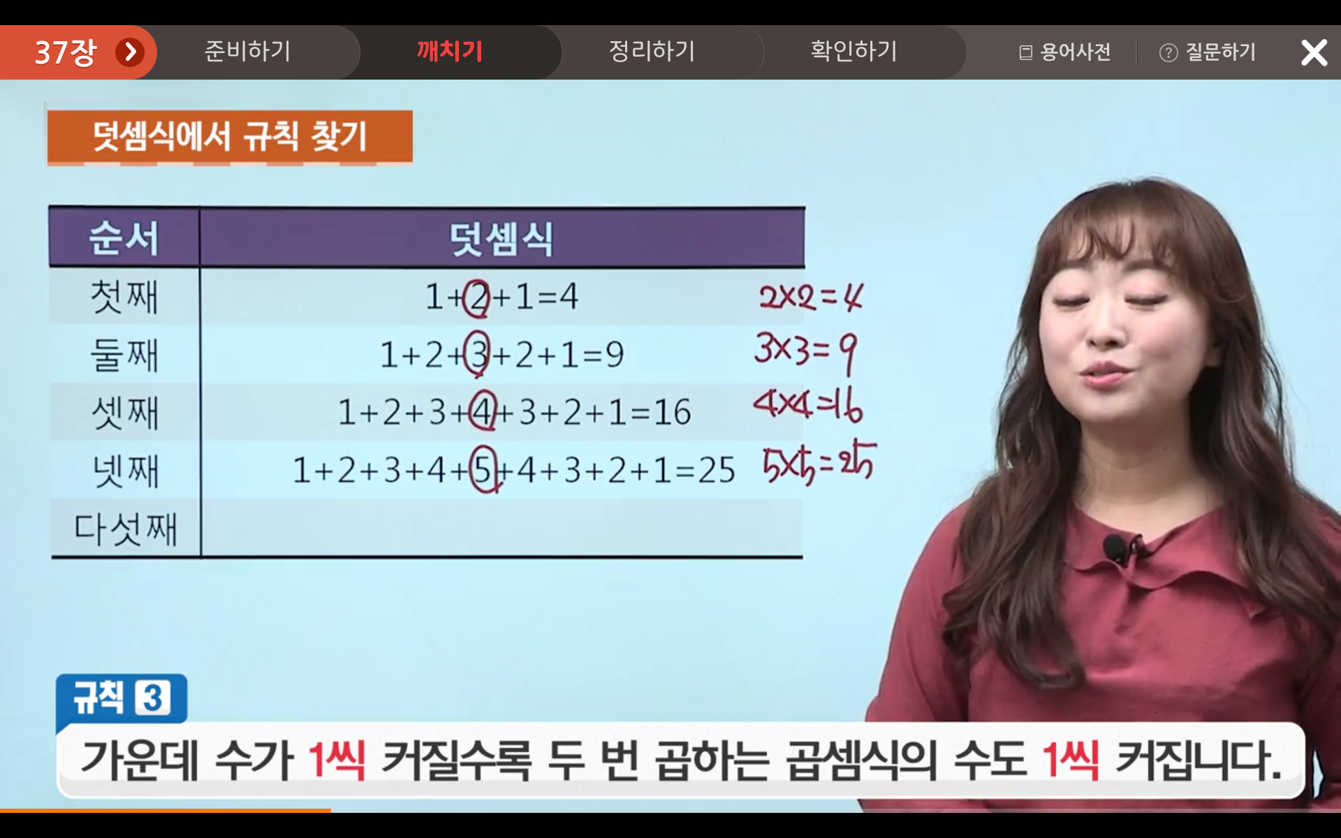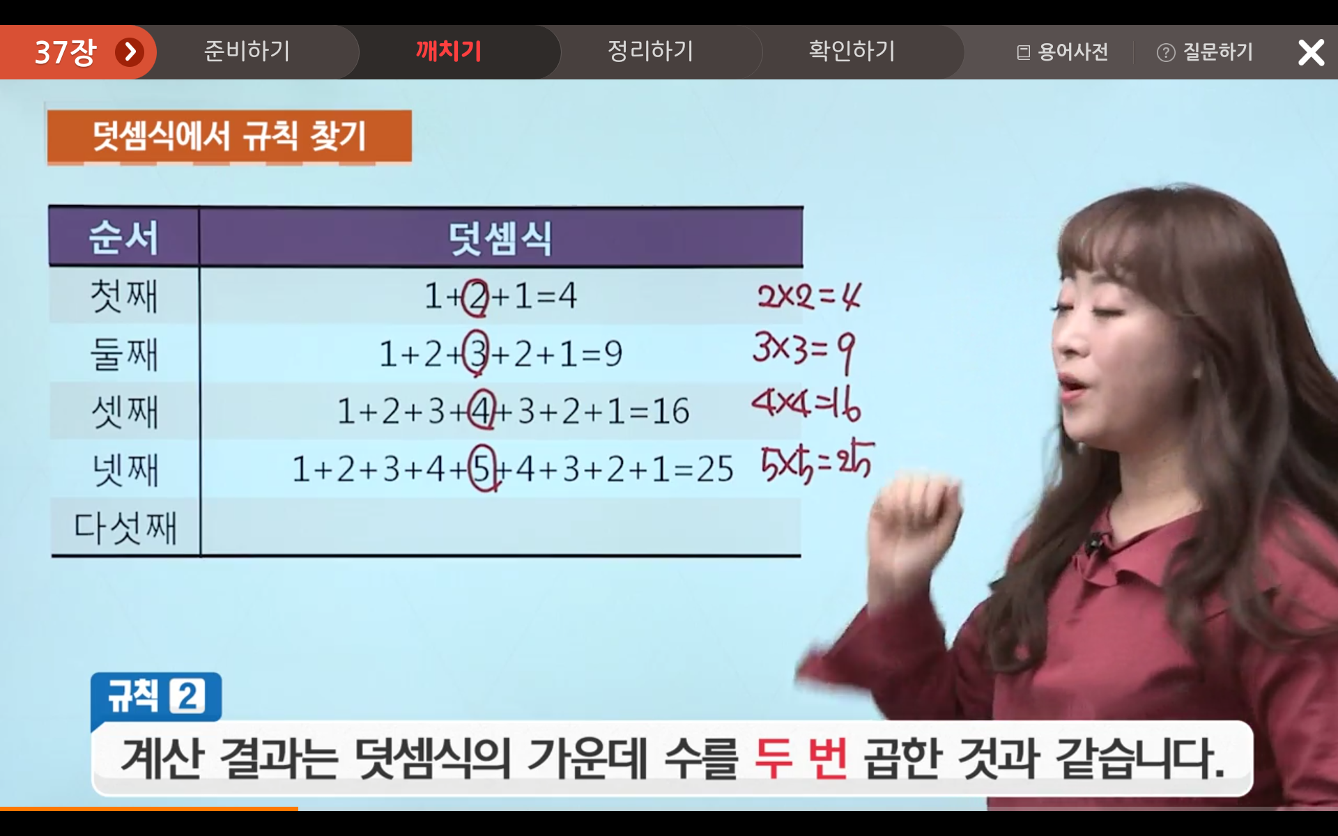 첫째의 합은 4(2x2), 둘째의 합은 9(3x3), 셋째의 합은 16(4x4), 넷째의 합은 25(5x5) 그렇다면 다섯째의 합은?
