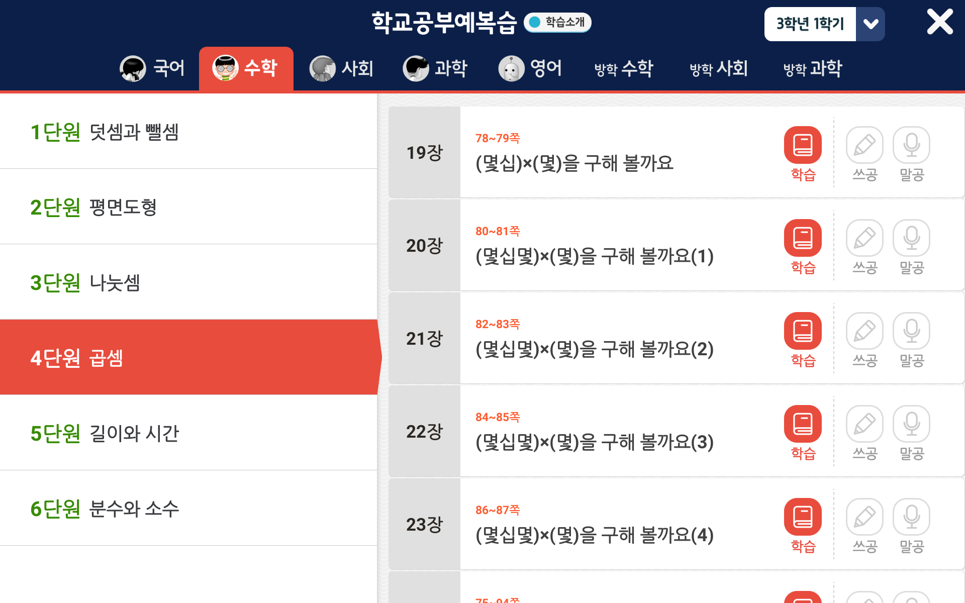 (몇십)×(몇), 올림이 없는 (몇십몇)×(몇), 십의 자리에서 올림이 있는 (몇십몇)×(몇), 일의 자리에서 올림이 있는 (몇십몇)×(몇),