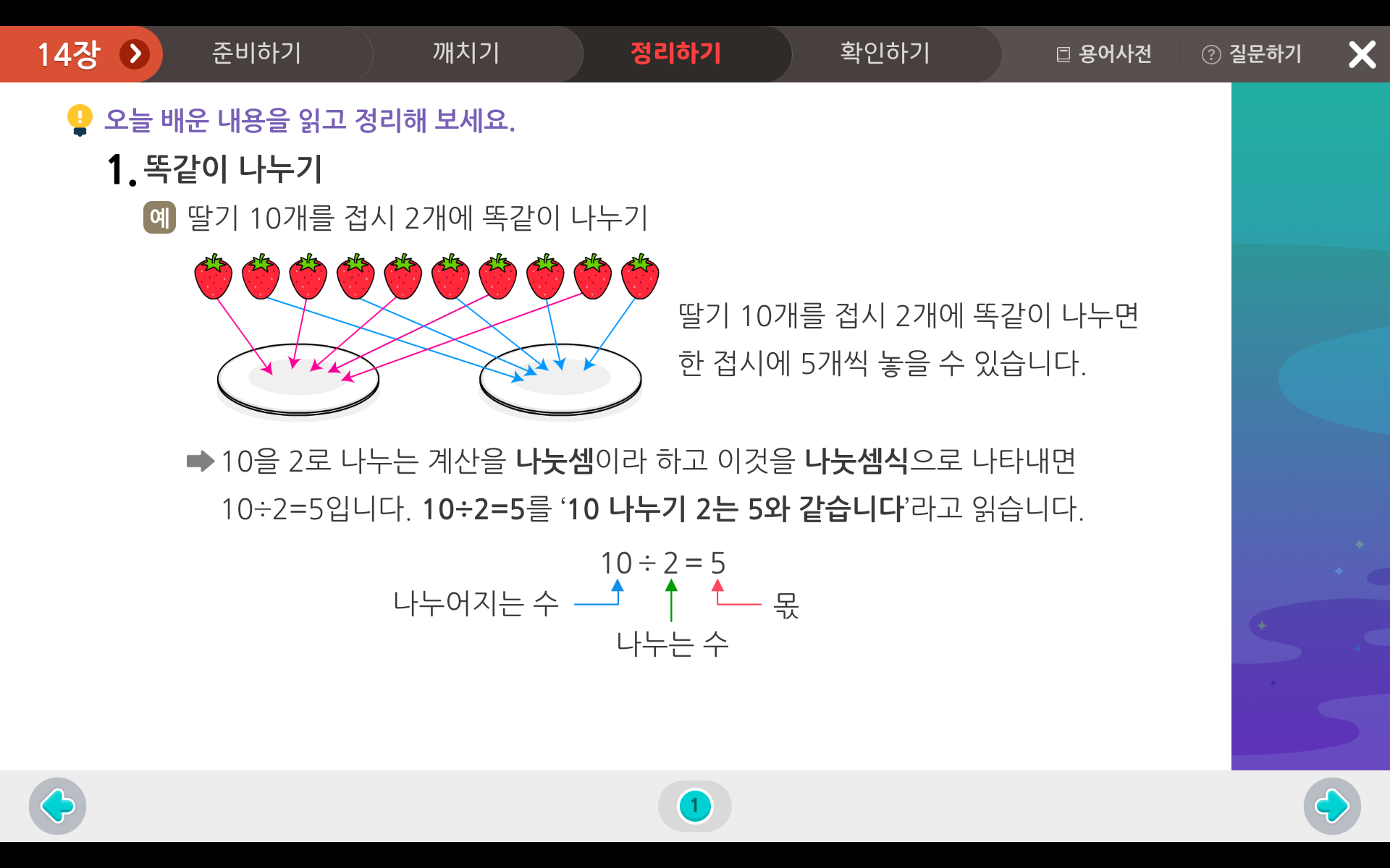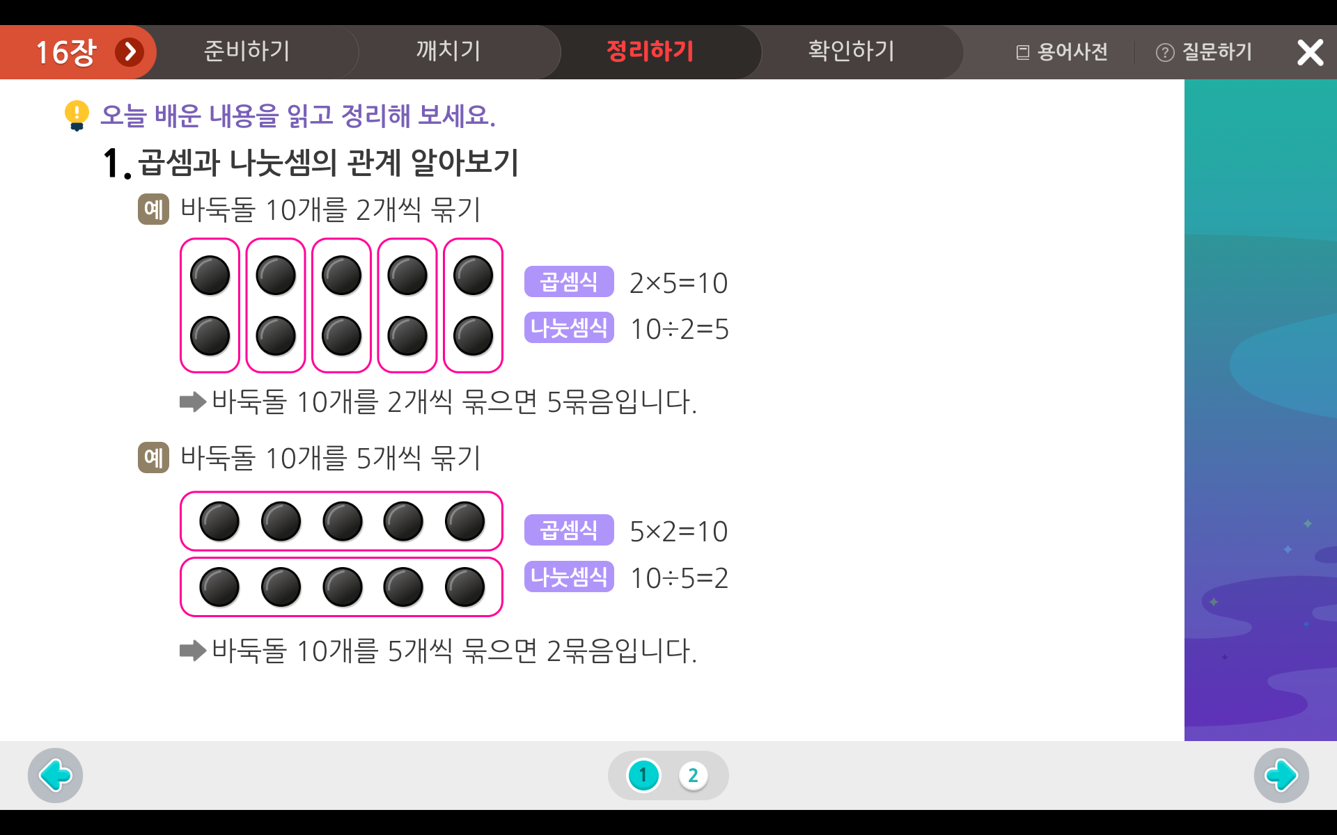 2명이 똑같이 나눌 때는 10개를 2묶음으로 묶으면 한 묶음에 5개씩으로 식으로 나타내면 ÷이며,