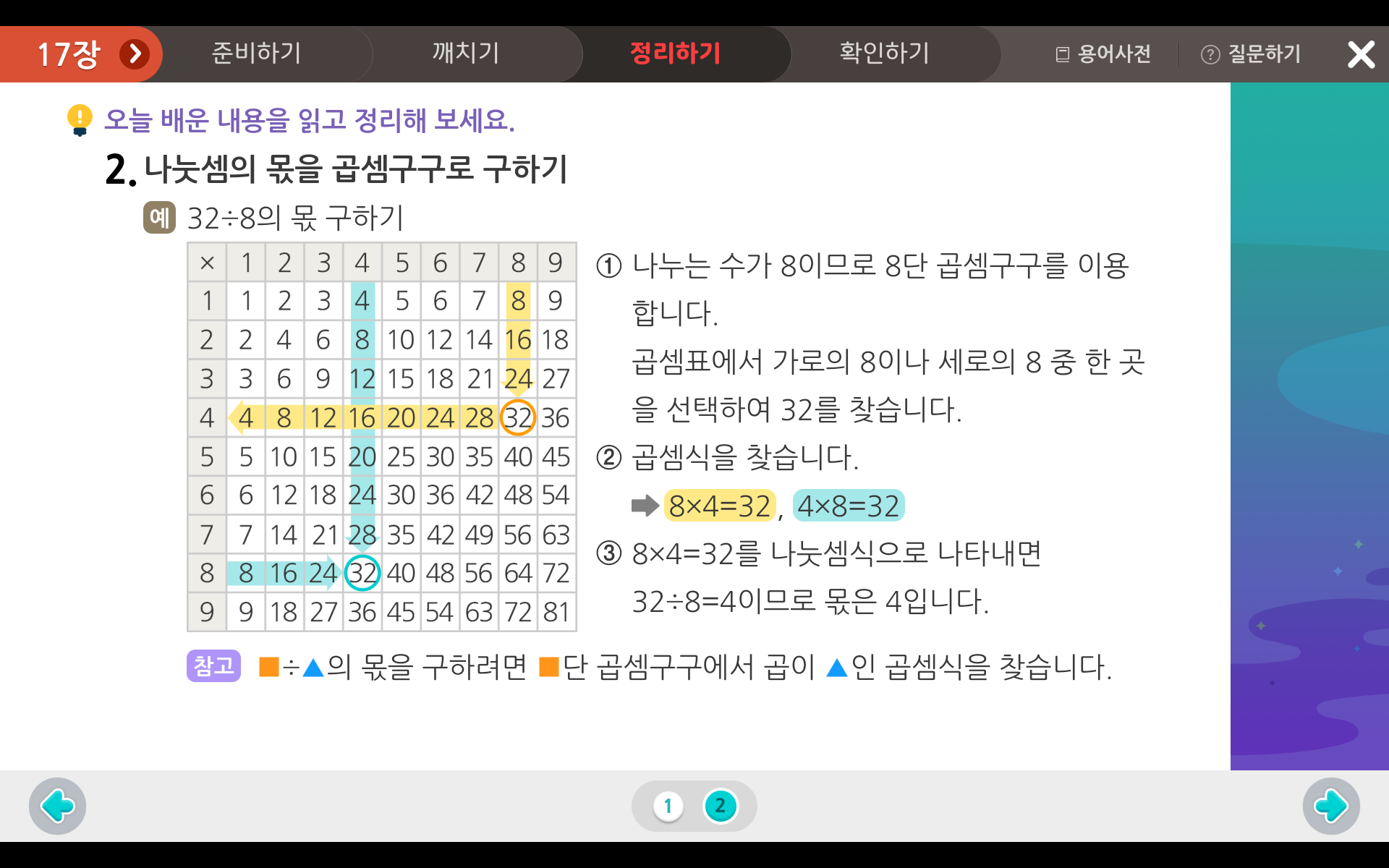 곱셈구구로 구할 때는 32에서 나누는 수가 4이므로 4의 단 곱셈구구를 이용하면 됩니다.