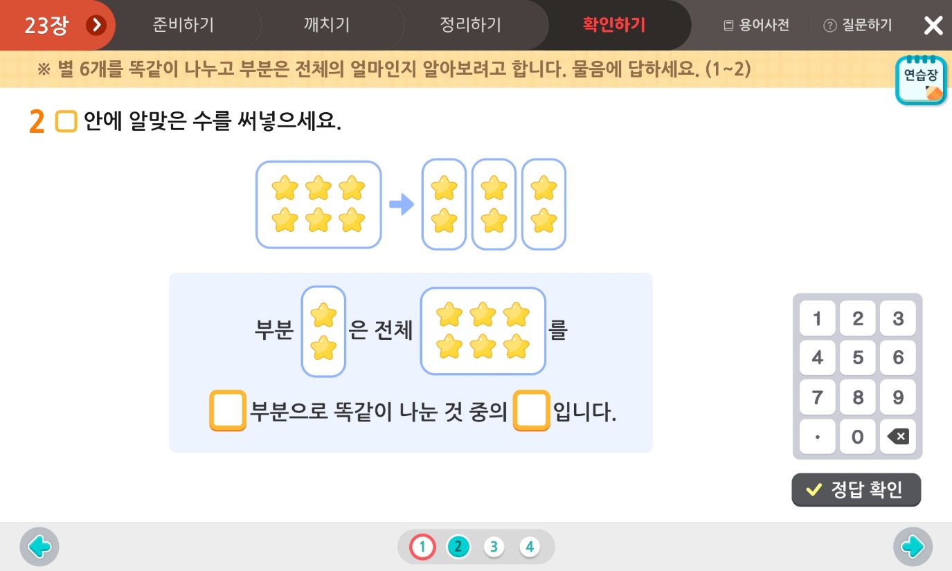 별 6개를 3부분으로 똑같이 나누면 한 부분에 별이 2개씩 입니다.