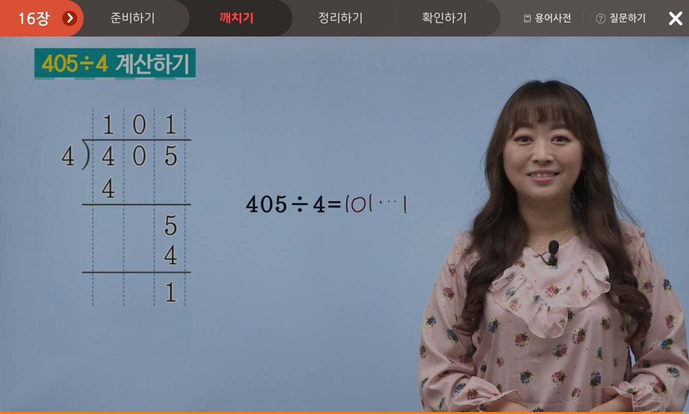 나머지가 있는 세 자리 수 ÷ 한 자리 수를 구해봅시다. 405÷4를 백의 자리부터 순서대로 나누면, 4÷4=1이 백의 자리가 됩니다. 십의 자리는 0이므로 0, 일의 자리는 5÷4=1…1, 모두 합쳐보면 몫: 101, 나머지: 1이 됩니다.