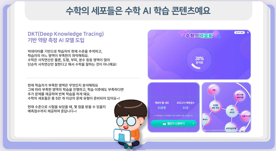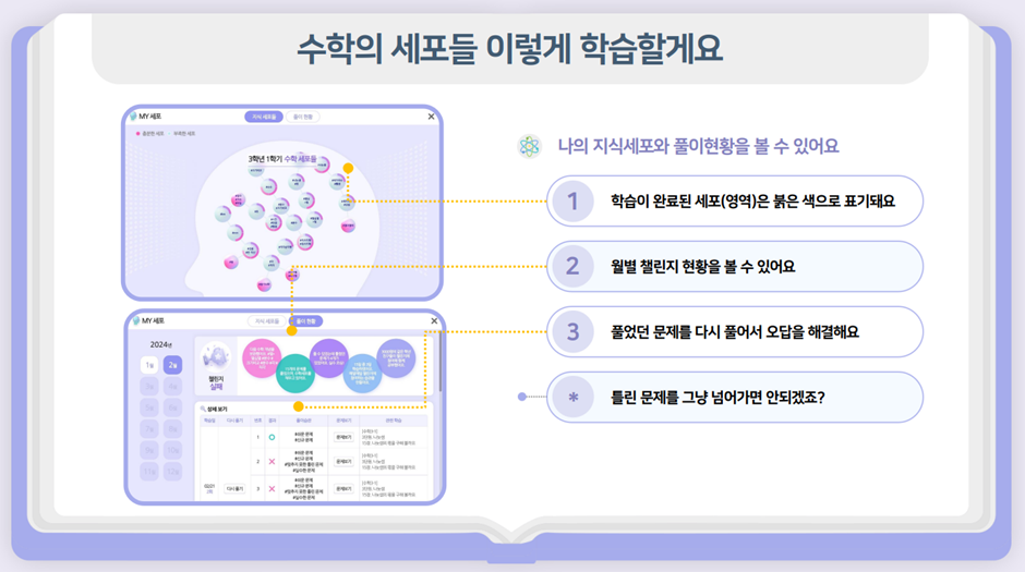 수학의 세포들이란 빅데이터를 기반으로 학습자의 현재 수준을 추적하고, 학습자의 어느 영역이 부족한지 파악해 줍니다.